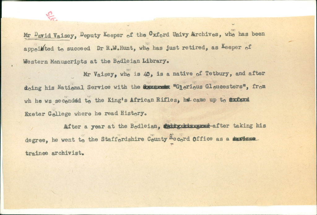 David Vaisey, Deputy Keeper of the Oxford University Archives, who has been appointed to succeed Dr. R. W. Hunt, as a Keeper of Western Manuscripts at the Bodleian Library. David Vaisey, Deputy Keeper of the Oxford University Archives, who has been appointed to succeed Dr. R. W. Hunt, as a Keeper of Western Manuscripts at the Bodleian Library.
