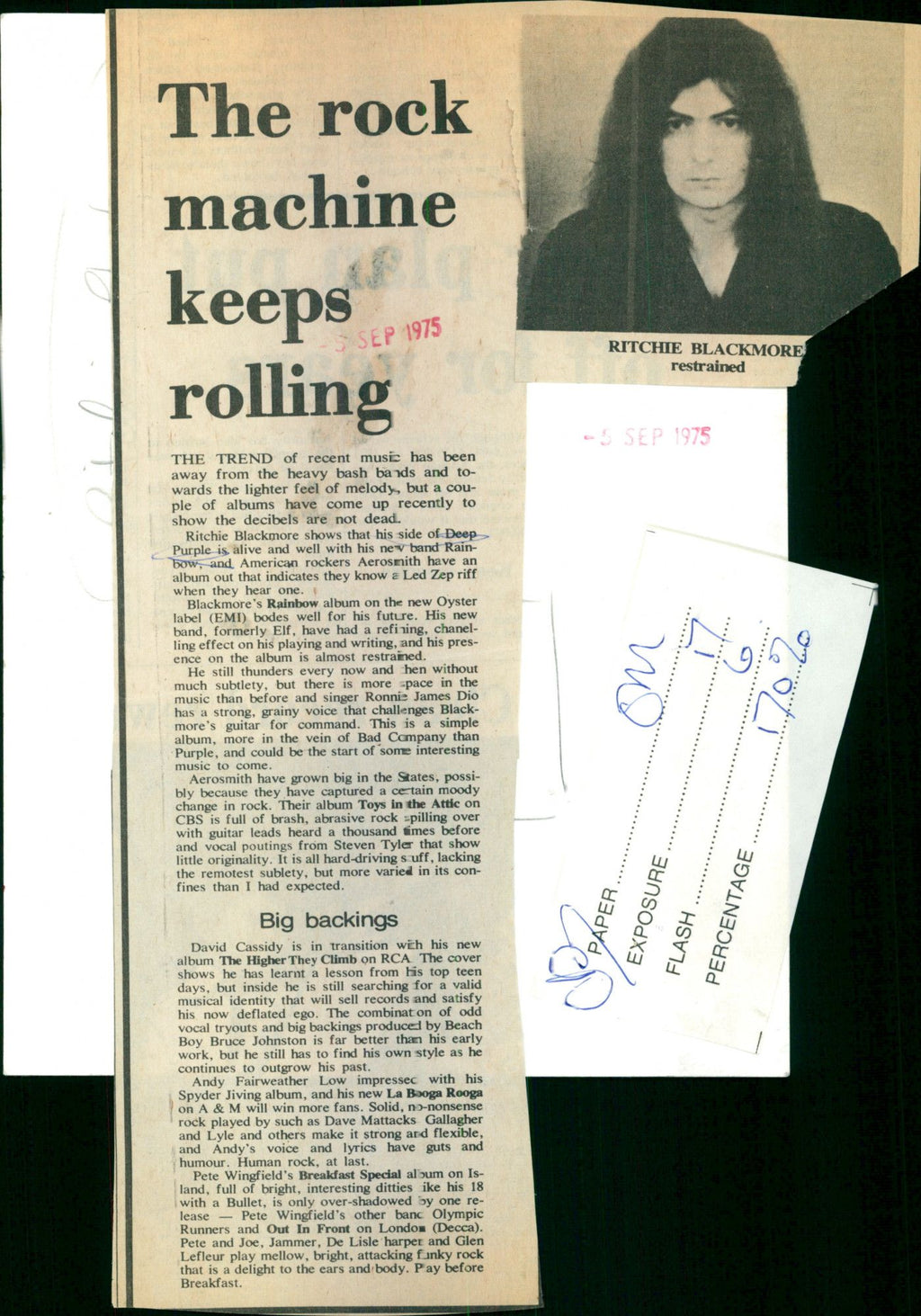 Ritchie Blackmore shows that his side of Deep Purple is alive and well with his new band Rainbow and American rockers Aerosmith have an album out that indicates they know a Led Zep riff when they hear one. Ritchie Blackmore shows that his side of Deep Purple is alive and well with his new band Rainbow and American rockers Aerosmith have an album out that indicates they know a Led Zep riff when they hear one.