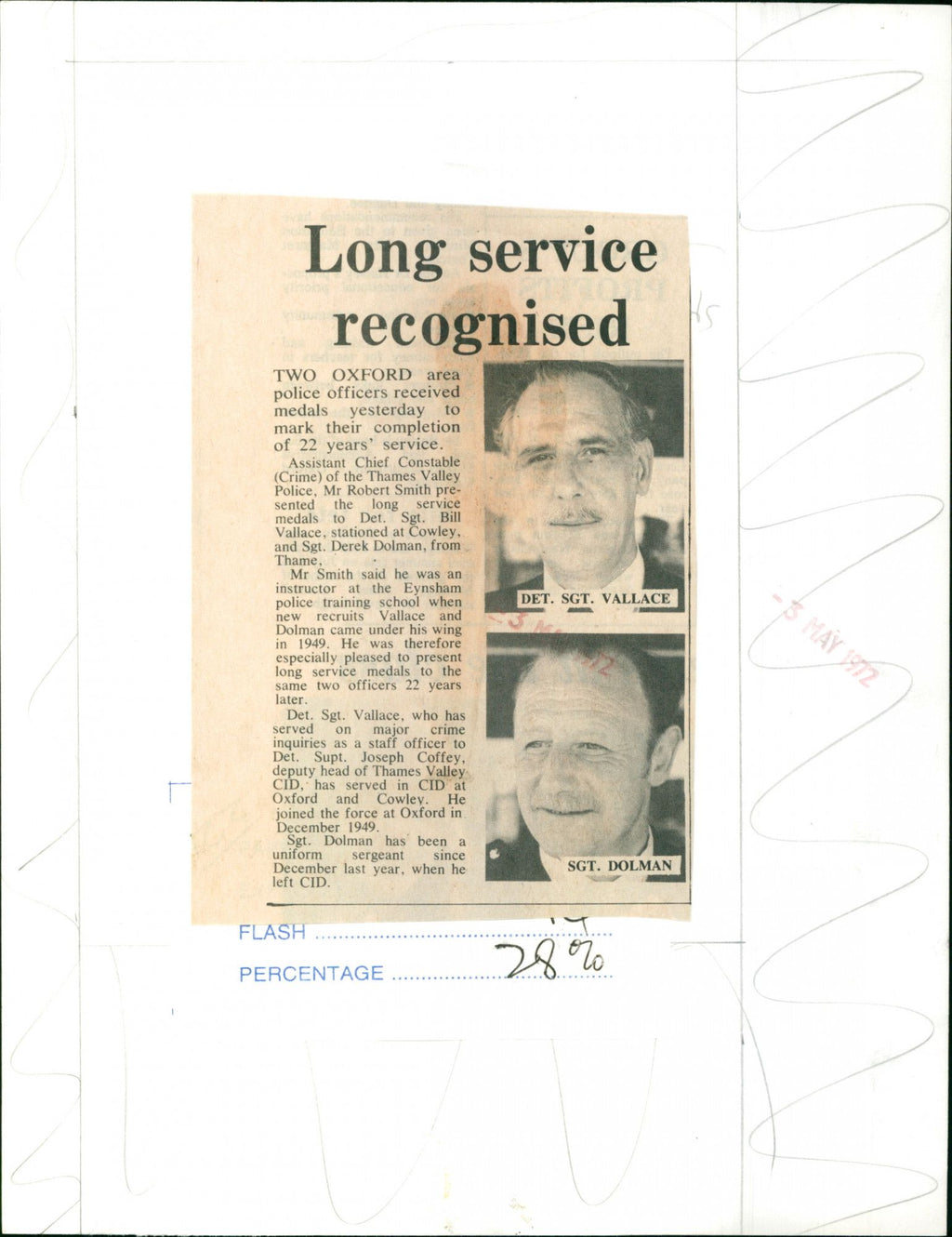 Two Oxford area police officers received medals to mark their completion of 22 years' service. Robert Smith presented the long service medal to Sgt. Derek Dolman, from Thame. Two Oxford area police officers received medals to mark their completion of 22 years' service. Robert Smith presented the long service medal to Sgt. Derek Dolman, from Thame.