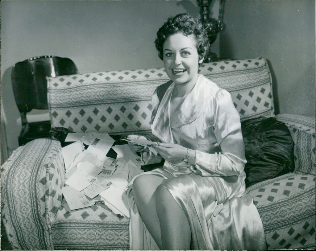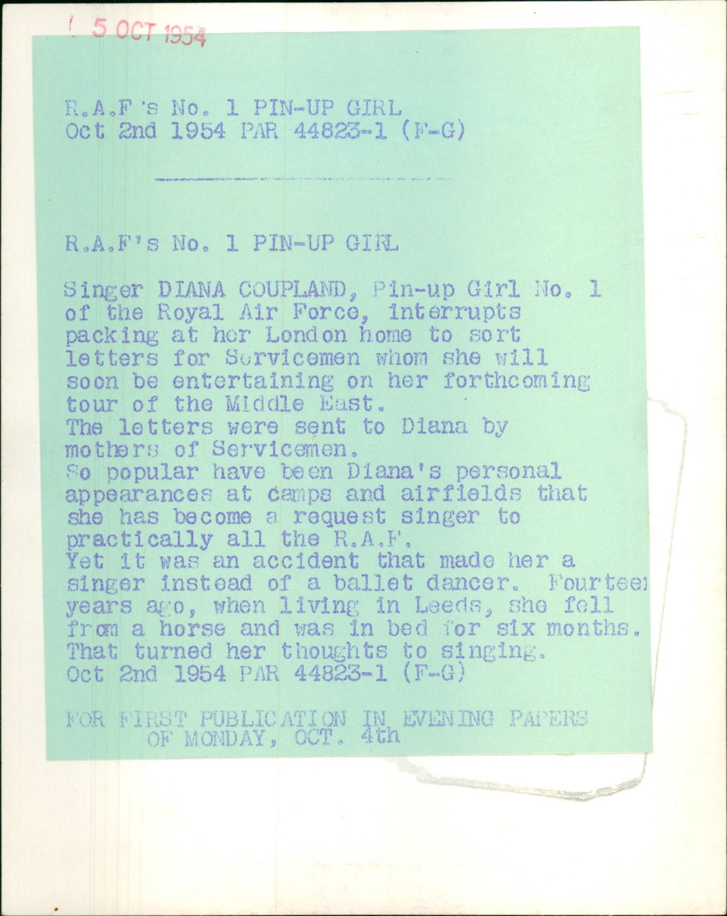 Singer Diana Coupland, Pin-up Girl No. 1 of the Royal Air Force, interrupts packing at her London home to sort letters for Servicemen. Singer Diana Coupland, Pin-up Girl No. 1 of the Royal Air Force, interrupts packing at her London home to sort letters for Servicemen.