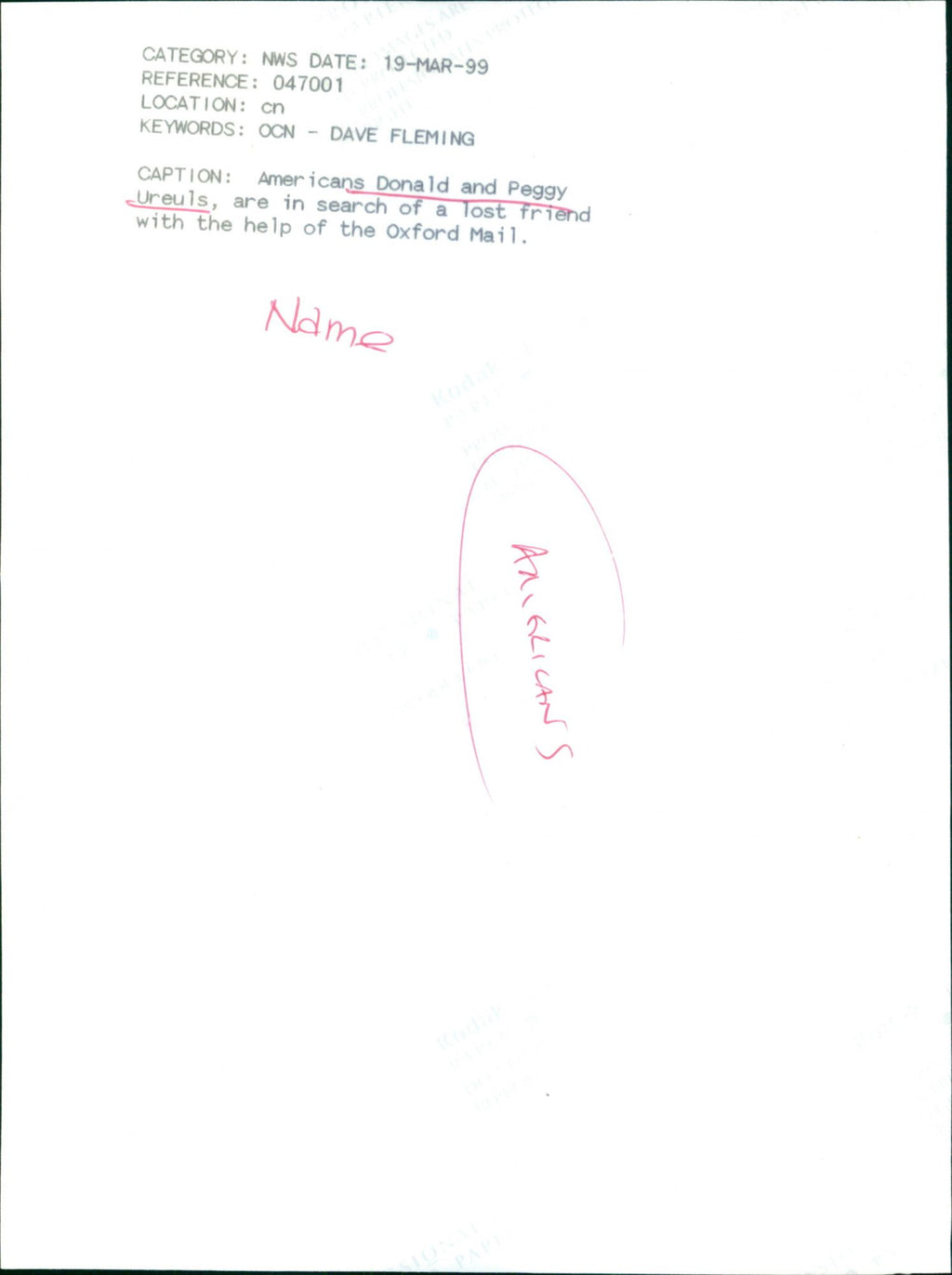 Americans Donald and Peggy Ureuls, are in search of a lost friend with the help of the Oxford Mail. Americans Donald and Peggy Ureuls, are in search of a lost friend with the help of the Oxford Mail.