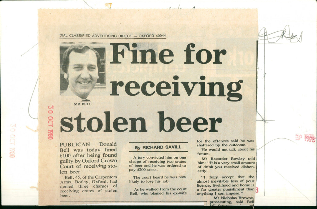 Publican Donald Bell was fined £100 after being found guilty by Oxford Crown Court of receiving stolen beer. Publican Donald Bell was fined £100 after being found guilty by Oxford Crown Court of receiving stolen beer.