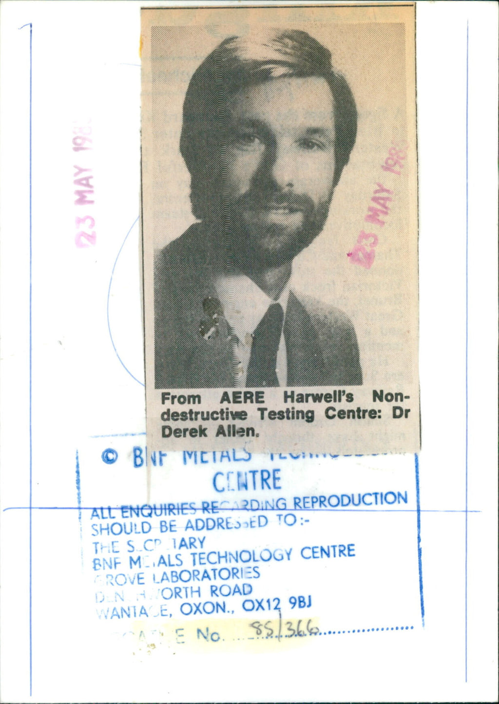 From AERE Harwell's Non-destructive Testing Centre: Dr. Derek Allen. From AERE Harwell's Non-destructive Testing Centre: Dr. Derek Allen.