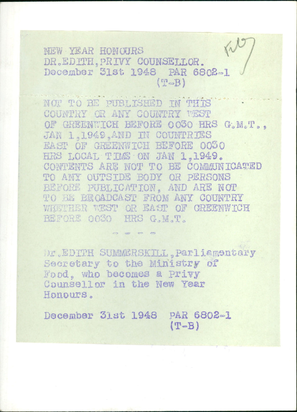 Dr. Edith Summerskill Parliamentary Secretary to the Ministry of Food who becomes a Privy Counsellor in the New Year Honours. Dr. Edith Summerskill Parliamentary Secretary to the Ministry of Food who becomes a Privy Counsellor in the New Year Honours.
