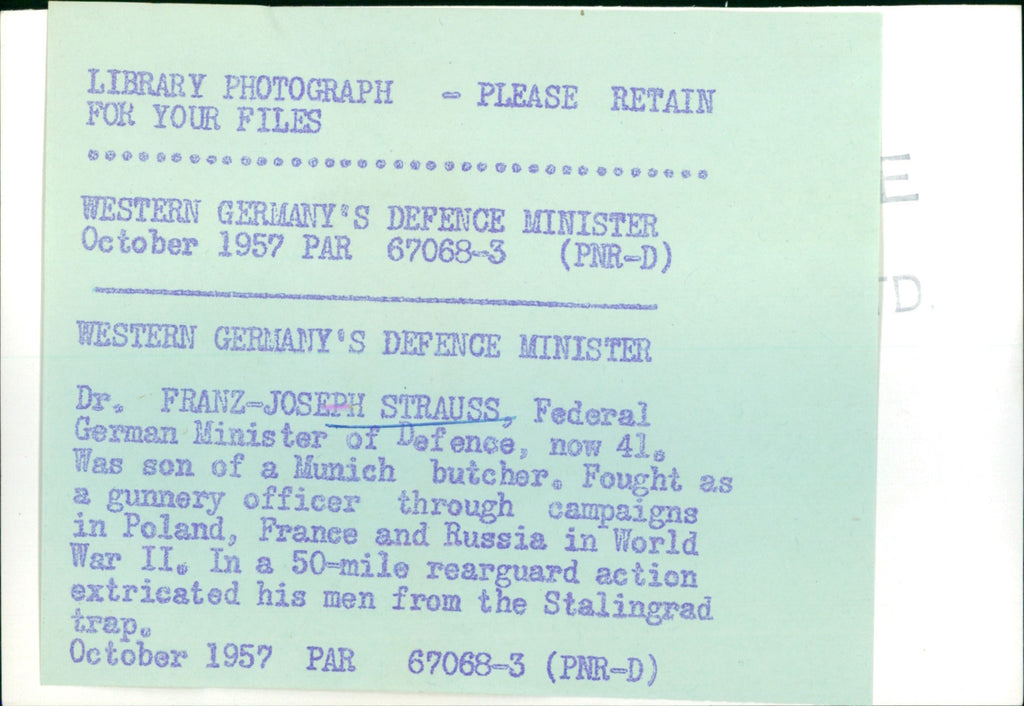 Dr. Franz-Joseph Strauss, Federal German Minister of Defence, now 41. Was son of a Munich butcher. Fought as gunnery officer through campaigns in Poland, France and Russian in World War II. In a 50-mile rearguard action extricated his men from the Stalingrad trap. Dr. Franz-Joseph Strauss, Federal German Minister of Defence, now 41. Was son of a Munich butcher. Fought as gunnery officer through campaigns in Poland, France and Russian in World War II. In a 50-mile rearguard action extricated his men from the Stalingrad trap.