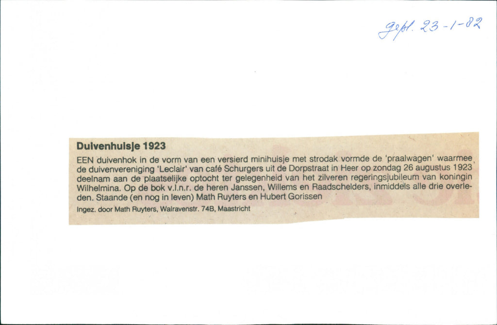 Eng: Dulven house 1923. A pigeon loft in the shape of a decorated mini-house with a thatched roof formed the 'float' with which the pigeon club 'Leclair' of café Schurgers in the Dorpsstraat in Heer took part in the local parade on the occasion of Queen Wilhelmina's silver jubilee on Sunday 26 August 1923. On the goat, from left to right: Messrs Janssen, Willems and Raadschelders, all three of whom have since passed away. Standing (and still alive) Math Ruyters and Hubert Gorissen. Dutch: Dulvenhuisje 1923. Een duivenhok in de vorm van een versierd minihuisje met strodak vormde de 'praalwagen' waarmee, de duivenvereniging 'Leclair' van cafe Schurgers uit de Dorpsstraat in Heer op zondag 26 augustus 1923 deelnam aan de plaatselijke optocht ter gelegenheid van het zilveren regeringsjubileum van koningin Wilhelmina. Op de bok v.l.n.r. de heren Janssen, Willems en Raadschelders, inmiddels alle drie overleden. Staande (en nog in leven) Math Ruyters en Hubert Gorissen. Eng: Dulven house 1923. A pigeon loft in the shape of a decorated mini-house with a thatched roof formed the 'float' with which the pigeon club 'Leclair' of café Schurgers in the Dorpsstraat in Heer took part in the local parade on the occasion of Queen Wilhelmina's silver jubilee on Sunday 26 August 1923. On the goat, from left to right: Messrs Janssen, Willems and Raadschelders, all three of whom have since passed away. Standing (and still alive) Math Ruyters and Hubert Gorissen. Dutch: Dulvenhuisje 1923. Een duivenhok in de vorm van een versierd minihuisje met strodak vormde de 'praalwagen' waarmee, de duivenvereniging 'Leclair' van cafe Schurgers uit de Dorpsstraat in Heer op zondag 26 augustus 1923 deelnam aan de plaatselijke optocht ter gelegenheid van het zilveren regeringsjubileum van koningin Wilhelmina. Op de bok v.l.n.r. de heren Janssen, Willems en Raadschelders, inmiddels alle drie overleden. Staande (en nog in leven) Math Ruyters en Hubert Gorissen.