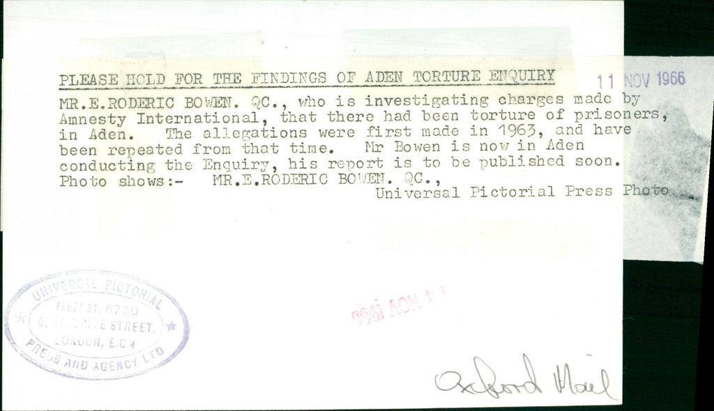 Mr. E. Roderic Bowen. QC., who is investigating charges made by Amnesty International, that there had been torture of prisoners in Aden. Mr. Bowen is now in Aden conducting the Enquiry, his report is to be published soo. Mr. E. Roderic Bowen. QC., who is investigating charges made by Amnesty International, that there had been torture of prisoners in Aden. Mr. Bowen is now in Aden conducting the Enquiry, his report is to be published soo.