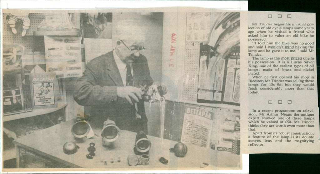 Eric Trinder, the cycle and motorcycle dealer for 49 years, since 1928. He began his unusual collection of old cycle lamps some years ago when he visited a friend who asked him to value an old bike he possessed. Eric Trinder, the cycle and motorcycle dealer for 49 years, since 1928. He began his unusual collection of old cycle lamps some years ago when he visited a friend who asked him to value an old bike he possessed.
