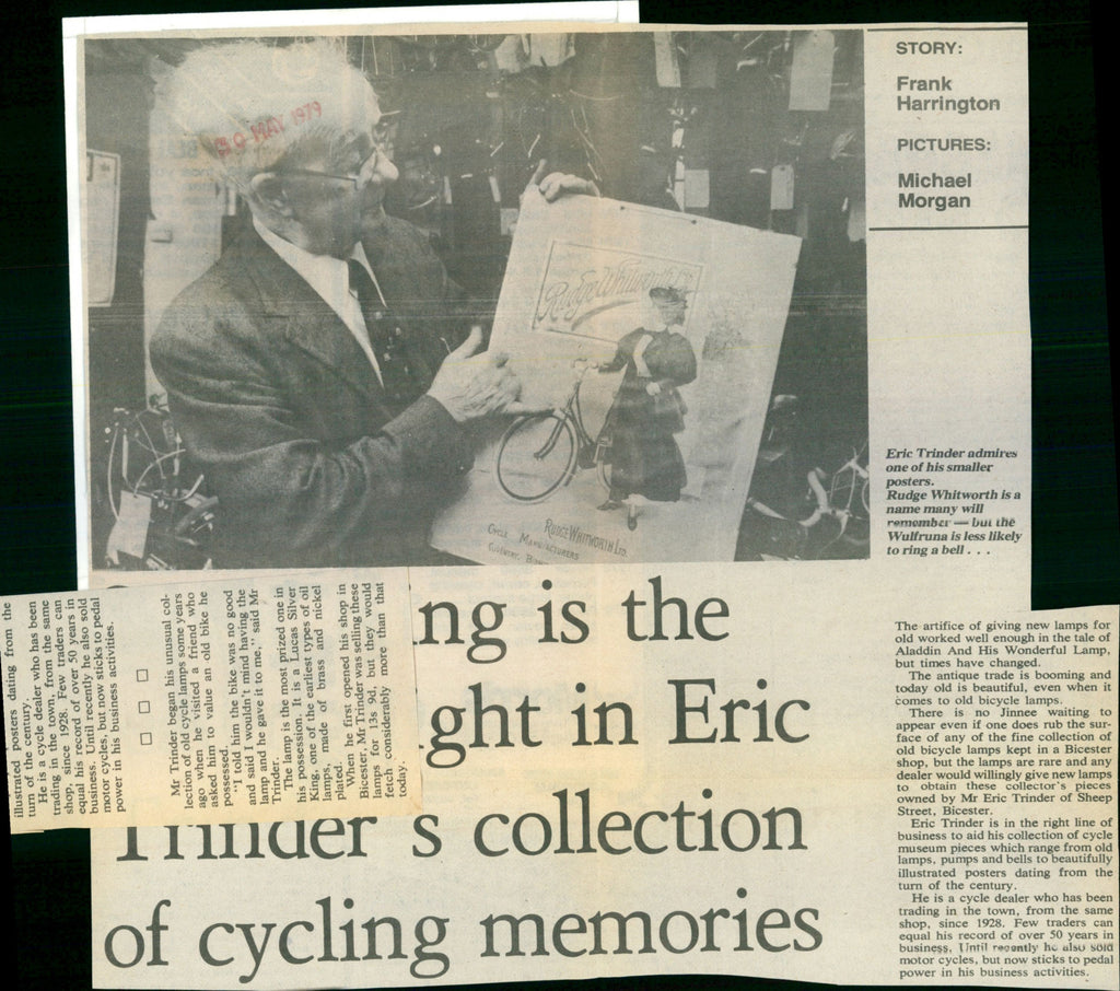 Eric Trinder, a cycle dealer for 49 years, since 1928. Mr. Trinder admires one of his smaller posters. Rudge Whitworth is a name many will remember, but Wulfruna is likely to ring a bell. Eric Trinder, a cycle dealer for 49 years, since 1928. Mr. Trinder admires one of his smaller posters. Rudge Whitworth is a name many will remember, but Wulfruna is likely to ring a bell.
