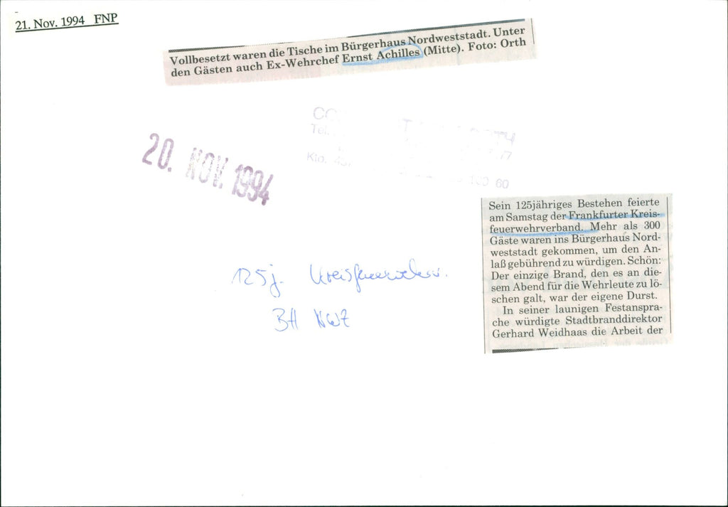 The Frankfurt District Fire Brigade Association celebrated its 125th anniversary in November 1994. The tables in the community center Nordweststadt were fully occupied. Among the guests also ex-military chief Ernst Achilles (center). Sein 125-jähriges Bestehen feierte im November 1994 der Frankfurter Kreisfeuerwehrverband. Vollbesetzt waren die Tische im Bürgerhaus Nordweststadt. Unter den Gästen auch Ex-Wehrchef Ernst Achilles (Mitte).