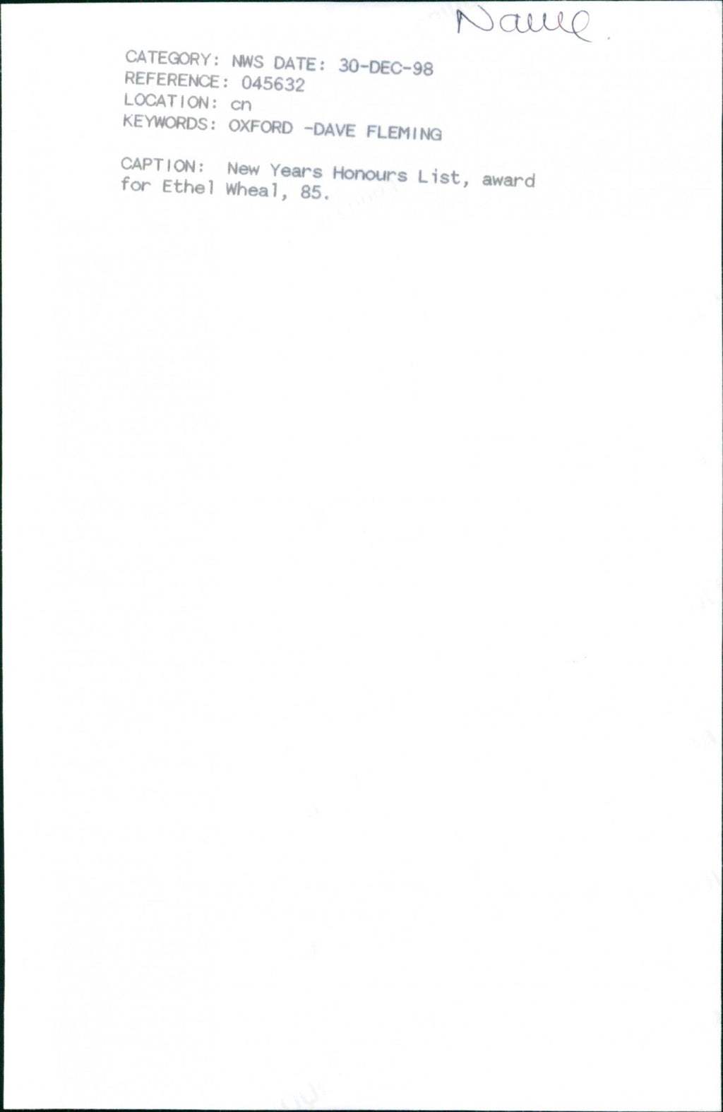 New Years Honours List, award for Ethel Wheal, 85. New Years Honours List, award for Ethel Wheal, 85.