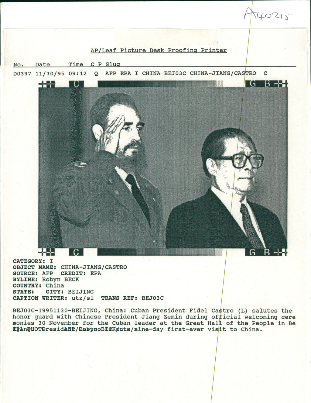 Cuban President Fidel Castro salutes the honor guard with Chinese President Jiang Zemin during the official welcome ceremonies for the Cuban leader at the Great hall of the People. Cuban President Fidel Castro salutes the honor guard with Chinese President Jiang Zemin during the official welcome ceremonies for the Cuban leader at the Great hall of the People.