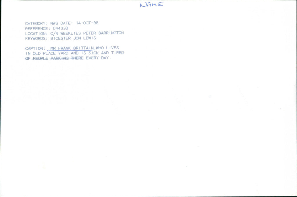 Mr Frank Brittain who lives in old place yard and is sick and tired of people parking there every day. Mr Frank Brittain who lives in old place yard and is sick and tired of people parking there every day.