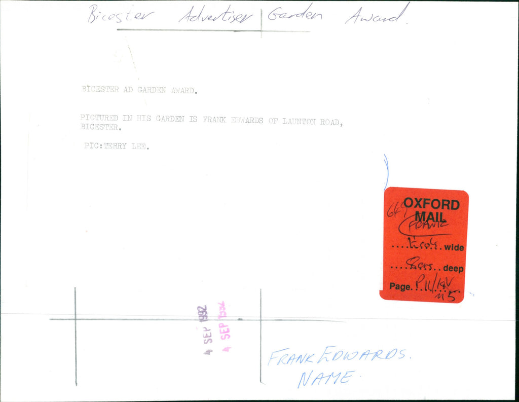 Bicester Ad Garden award. Pictured in his garden is Frank Edwards of Launton Road, Bicester. Bicester Ad Garden award. Pictured in his garden is Frank Edwards of Launton Road, Bicester.