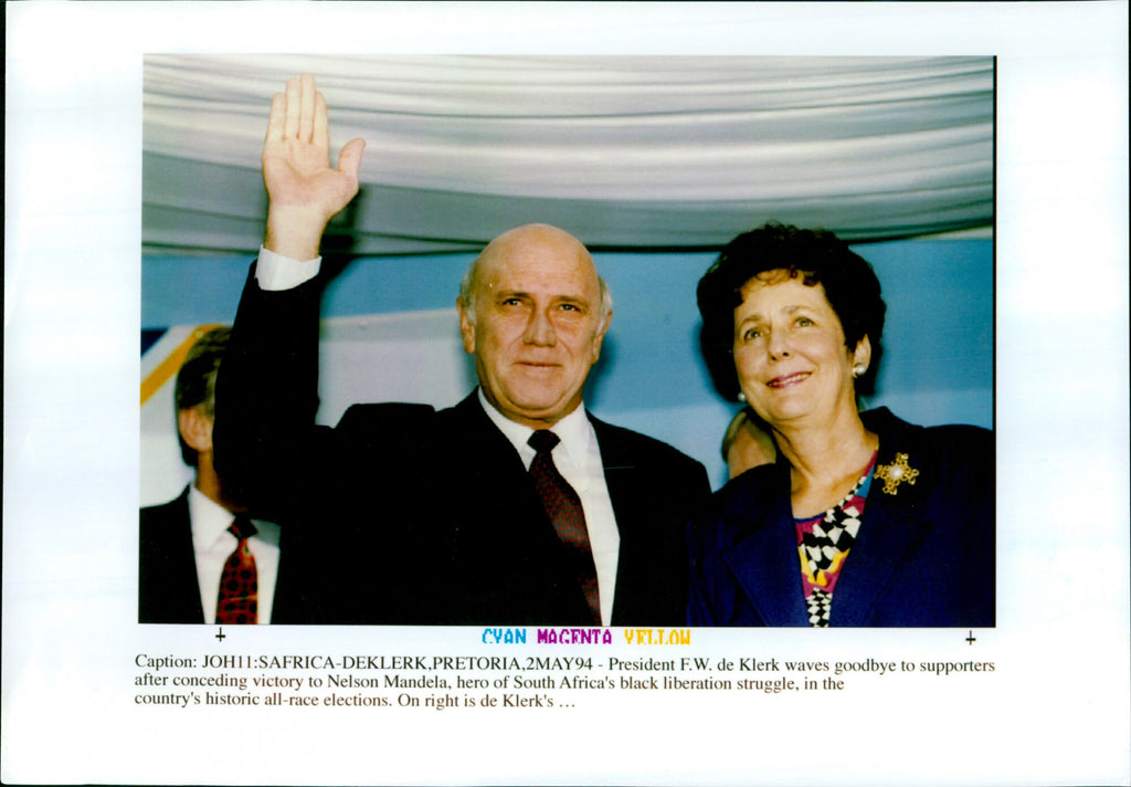 President F.W. de Klerk waves goodbye to supporters after conceding victory to Nelson Mandela. President F.W. de Klerk waves goodbye to supporters after conceding victory to Nelson Mandela.