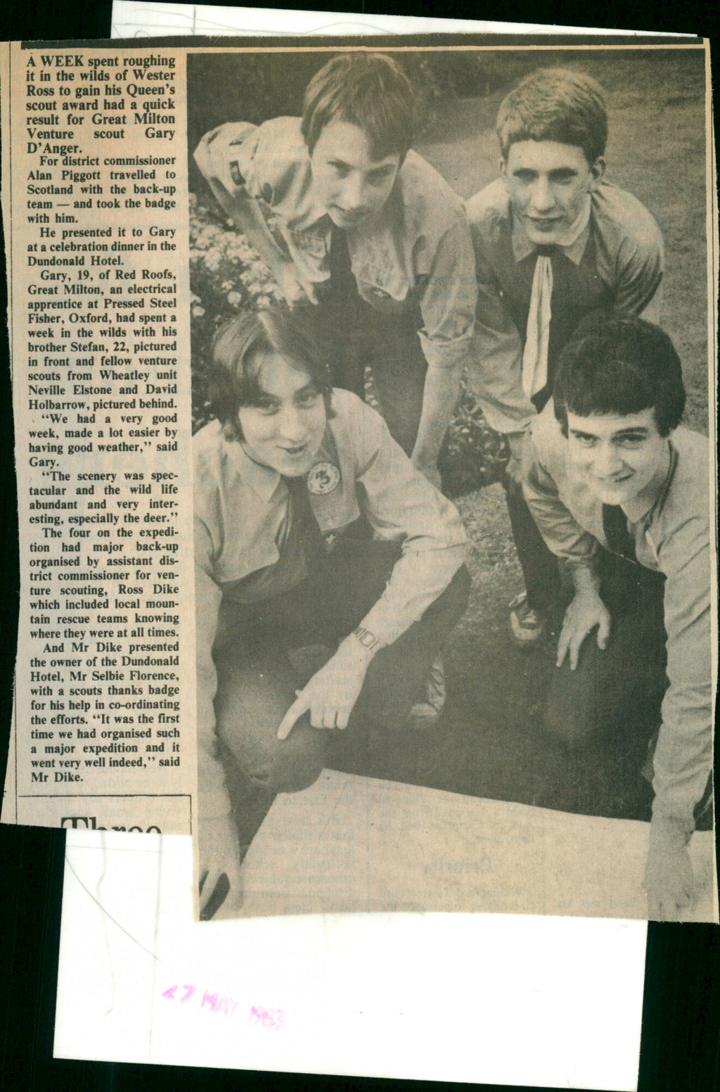 Gary D'Anger of Red Roofs, Great Milton, an electrical apprentice at Presses Steel Fisher, Oxford, had spent a week in the wilds with his brother Stefan and fellow venture scouts from Wheatley unit Neville Elstone and David Holbarrow. Gary D'Anger of Red Roofs, Great Milton, an electrical apprentice at Presses Steel Fisher, Oxford, had spent a week in the wilds with his brother Stefan and fellow venture scouts from Wheatley unit Neville Elstone and David Holbarrow.