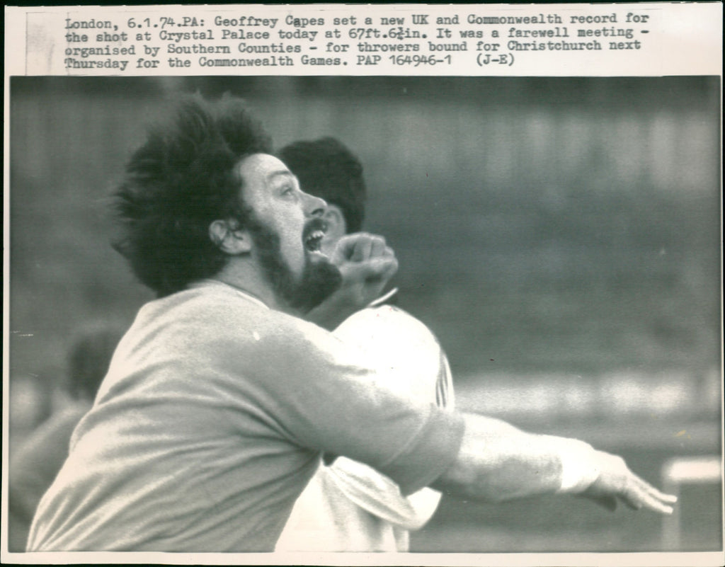 Geoffrey Capea set a new UK and Commonwealth record for the shot at Crystal palace at 67 ft.63/4in.It was a farewell meeting organised by southern countries-for throwers bound for christchurch next thursday for the commonwealth games Geoffrey Capea set a new UK and Commonwealth record for the shot at Crystal palace at 67 ft.63/4in.It was a farewell meeting organised by southern countries-for throwers bound for christchurch next thursday for the commonwealth games