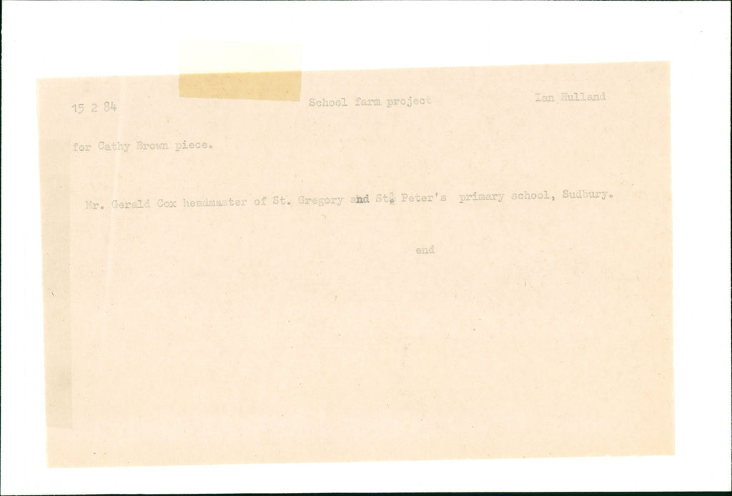 Mr. Gerald Cox, Headmaster of St. Gregory and St. Peter's primary school, Sudbury. Mr. Gerald Cox, Headmaster of St. Gregory and St. Peter's primary school, Sudbury.