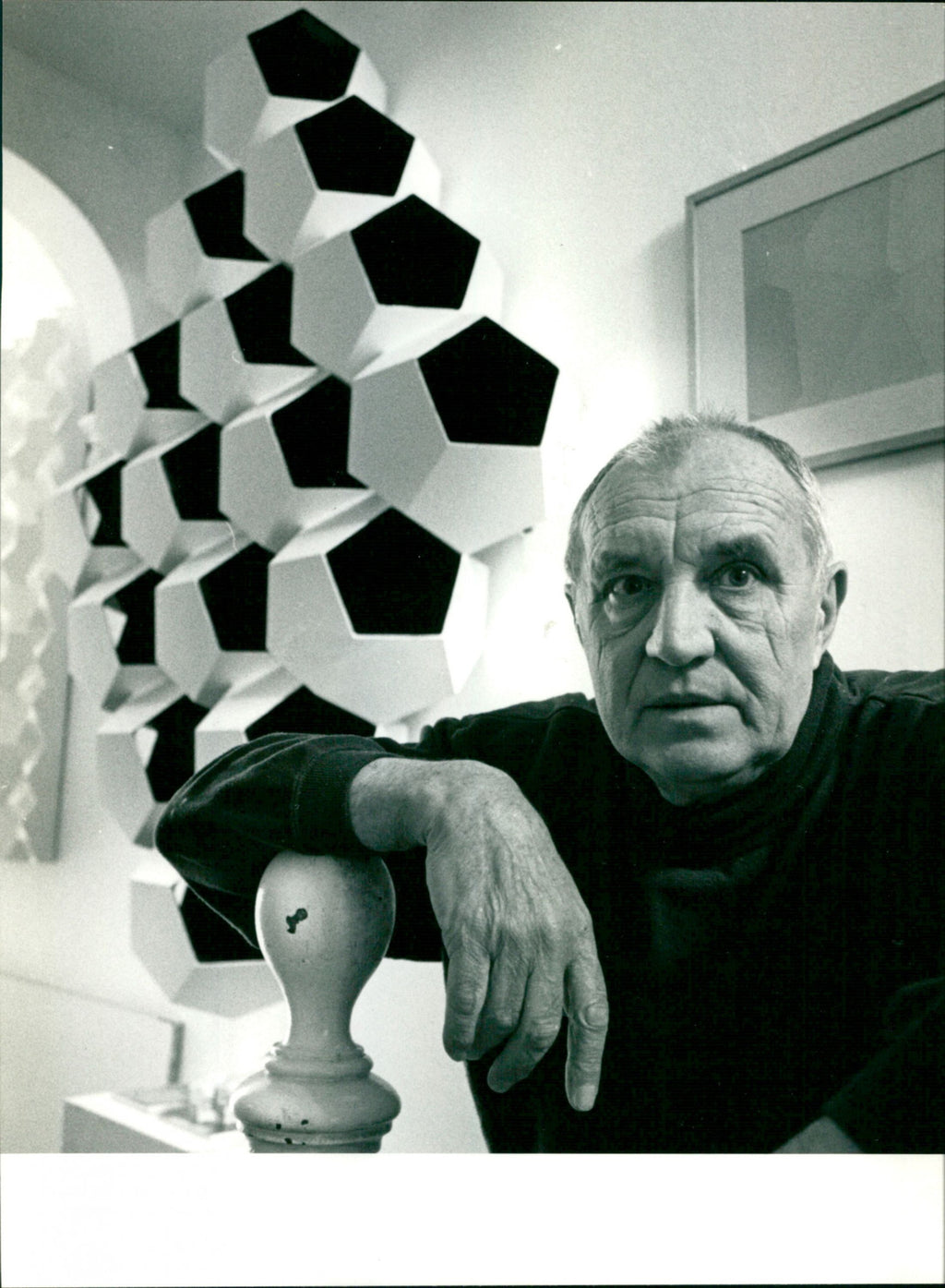 Eng: Gerard Caris and a spatial relief composed of dodecahedrons. Dutch: Gerard Caris en een ruimtelijk relief opgebouwd uit dodecaëders. Eng: Gerard Caris and a spatial relief composed of dodecahedrons. Dutch: Gerard Caris en een ruimtelijk relief opgebouwd uit dodecaëders.