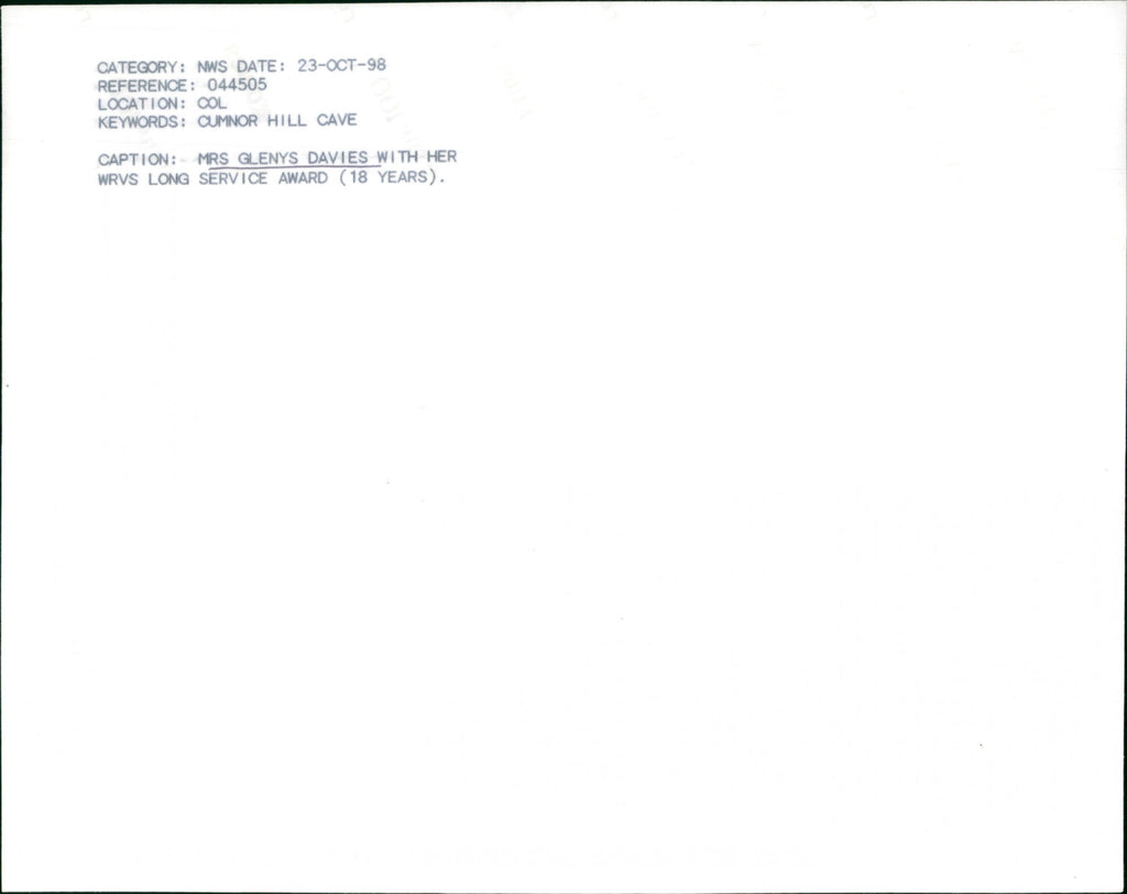 Mrs Glenys Davies with her WRVS long service award (18 years). Mrs Glenys Davies with her WRVS long service award (18 years).