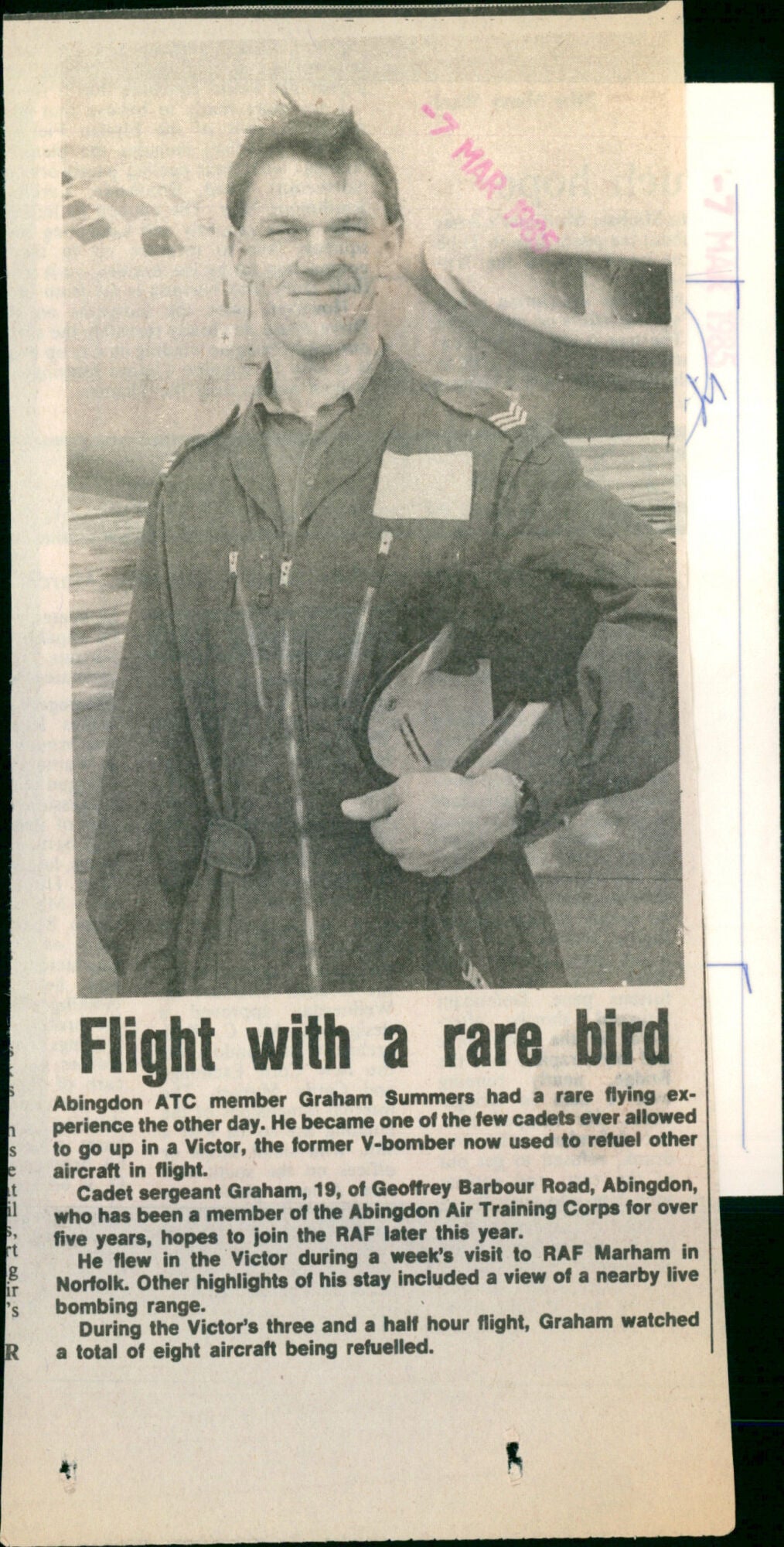 Abingdon ATC member Graham Summers has a rare flying experience the other day. He became one of the few cadets ever allowed to go up in a Victor the former V-bomber now used to refuel other aircraft in flight. Abingdon ATC member Graham Summers has a rare flying experience the other day. He became one of the few cadets ever allowed to go up in a Victor the former V-bomber now used to refuel other aircraft in flight.