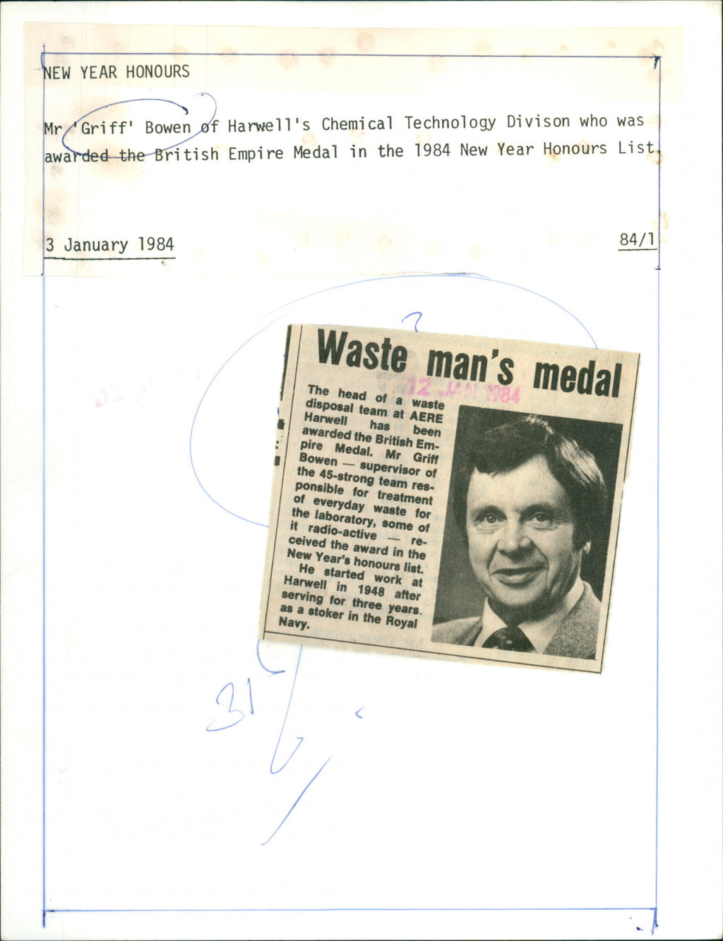 Mr. Griff Bowen of Harwell's Chemical Technology Division who was awarded the British Empire Medal in the 1984 New Year Honours List. Mr. Griff Bowen of Harwell's Chemical Technology Division who was awarded the British Empire Medal in the 1984 New Year Honours List.