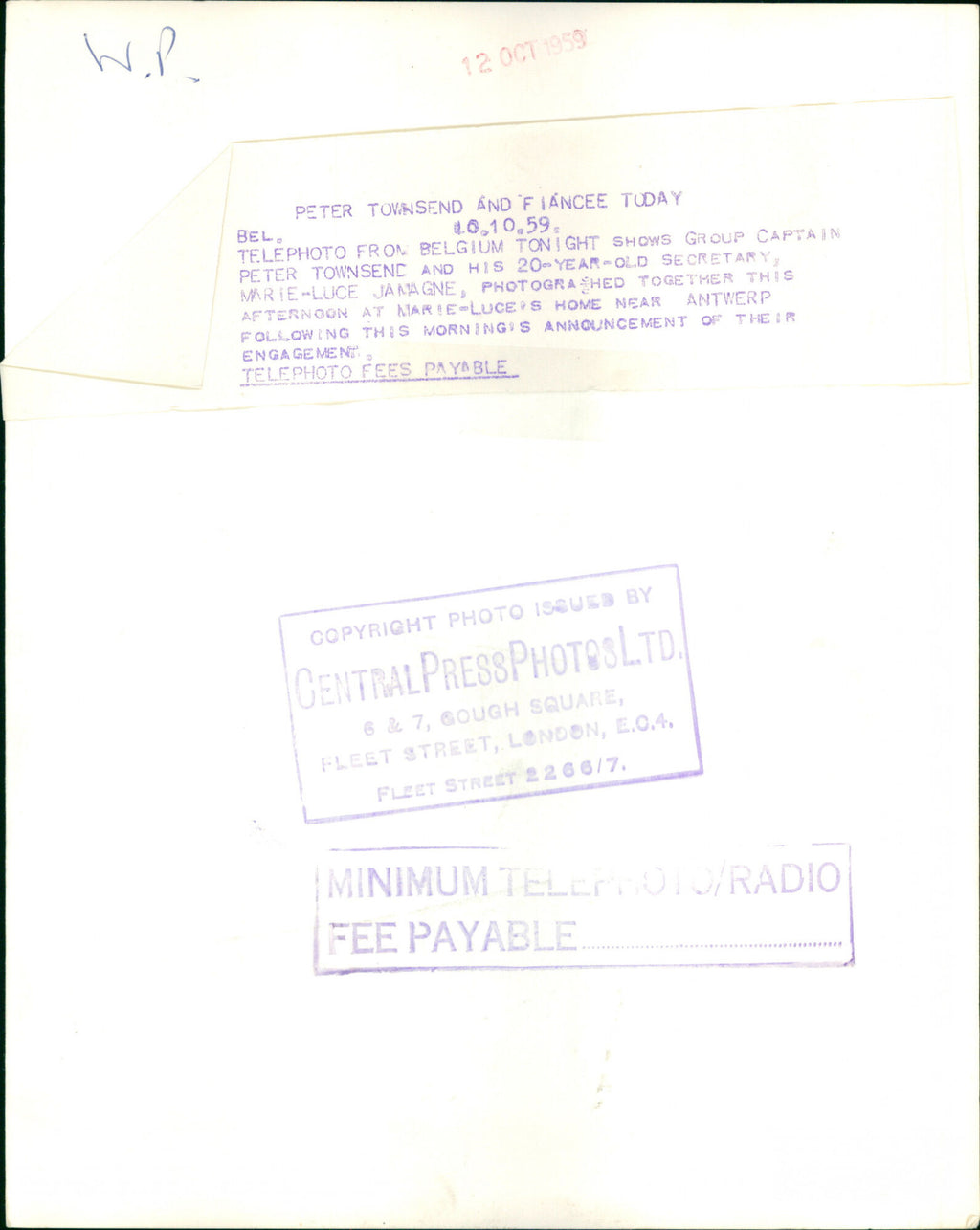 Group Captain Peter Townsend and his secretary, Marie-Luce Jamagne, at Marie-Luce's home. Group Captain Peter Townsend and his secretary, Marie-Luce Jamagne, at Marie-Luce's home.