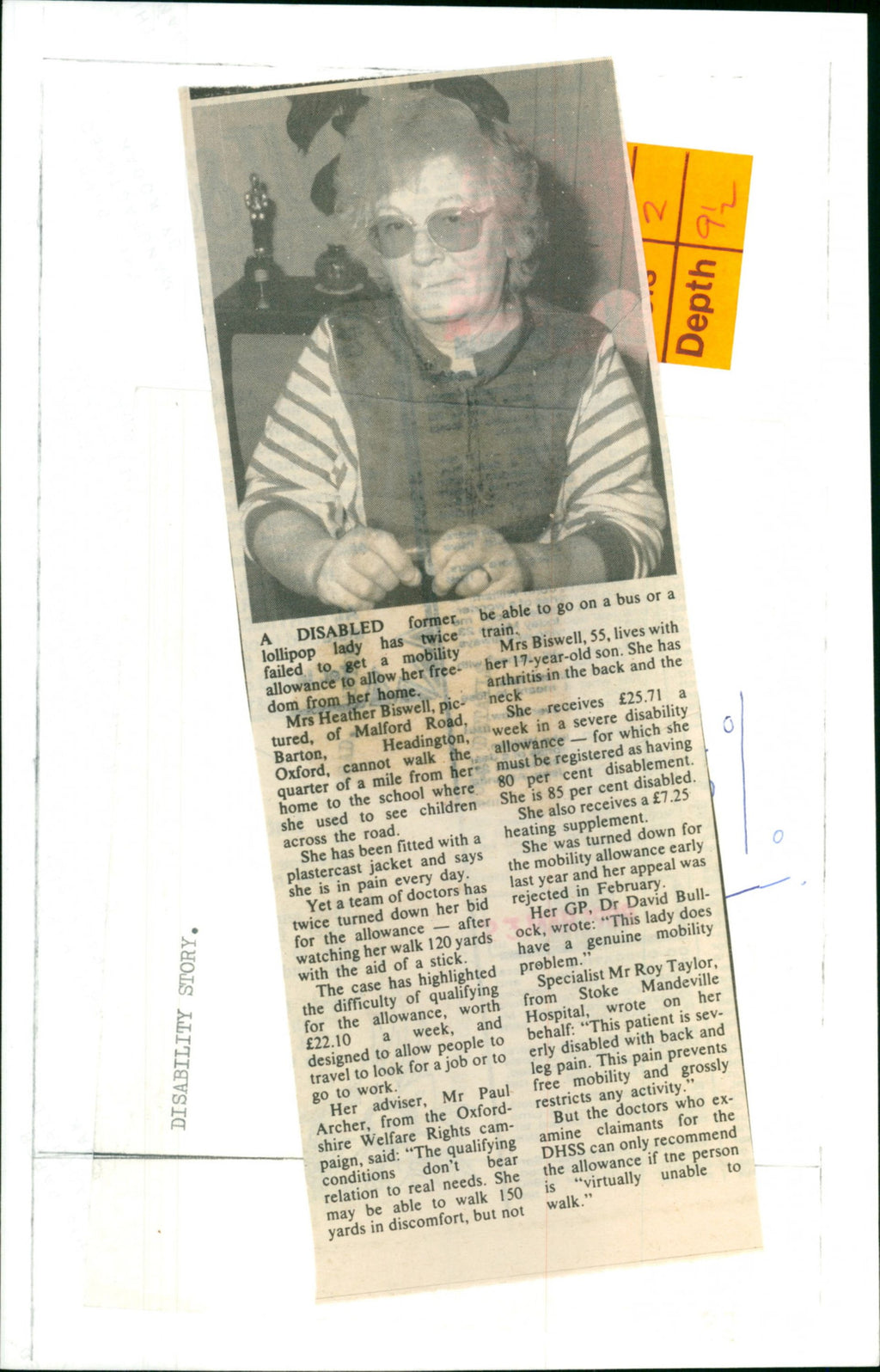 Former lollipop lady who has failed to get a mobility allowance to allow her freedom from her home Former lollipop lady who has failed to get a mobility allowance to allow her freedom from her home