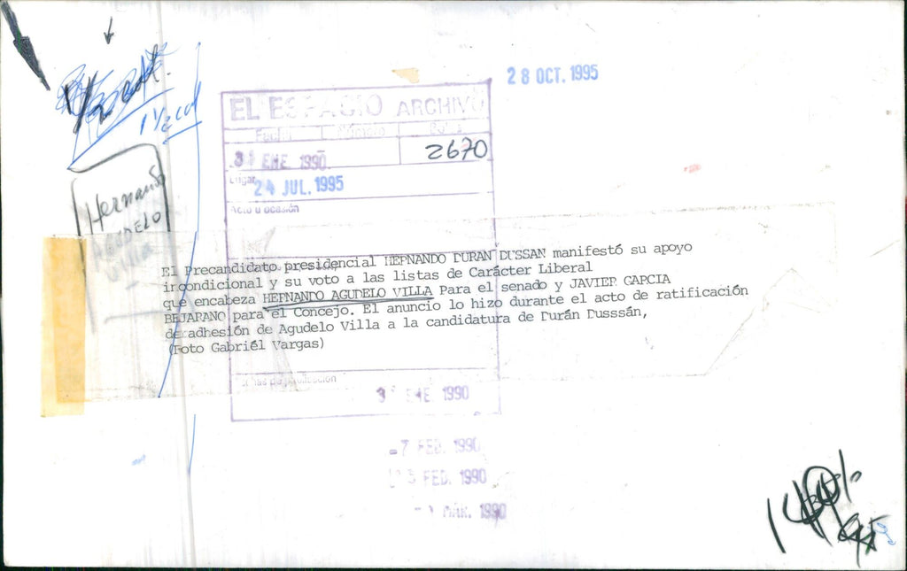 The Pre-Candidate. President HERNANDO DURAN DUSSAN (2nd from left) expressed his unconditional support and vote for the Liberal Party list headed by HERNANDO AGUDELO VILLA (rightmost) for the Senate and JAVIER GARCIA BEJARANO for the Council. The announcement was made during the act of ratification of the accession of Agudelo Villa to the candidacy of Durán Dusssán The Pre-Candidate. President HERNANDO DURAN DUSSAN (2nd from left) expressed his unconditional support and vote for the Liberal Party list headed by HERNANDO AGUDELO VILLA (rightmost) for the Senate and JAVIER GARCIA BEJARANO for the Council. The announcement was made during the act of ratification of the accession of Agudelo Villa to the candidacy of Durán Dusssán