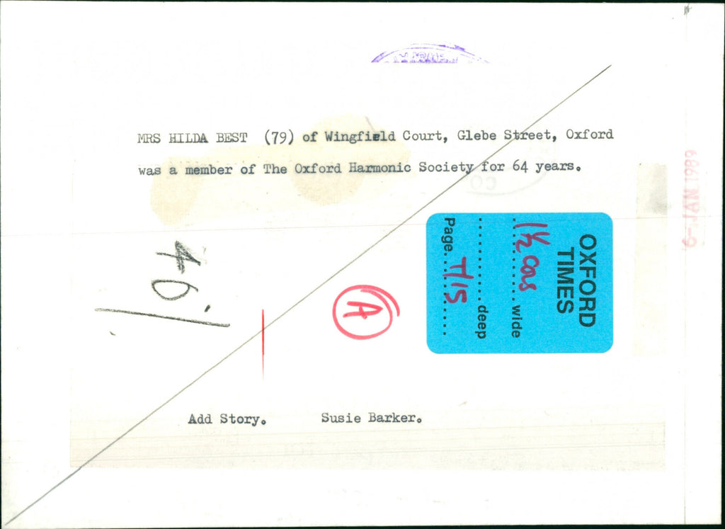 Mrs Hilda Best of Wingfield Court, Glebe Street, Oxford was a member of The Oxford Harmonic Society for 64 years. Mrs Hilda Best of Wingfield Court, Glebe Street, Oxford was a member of The Oxford Harmonic Society for 64 years.