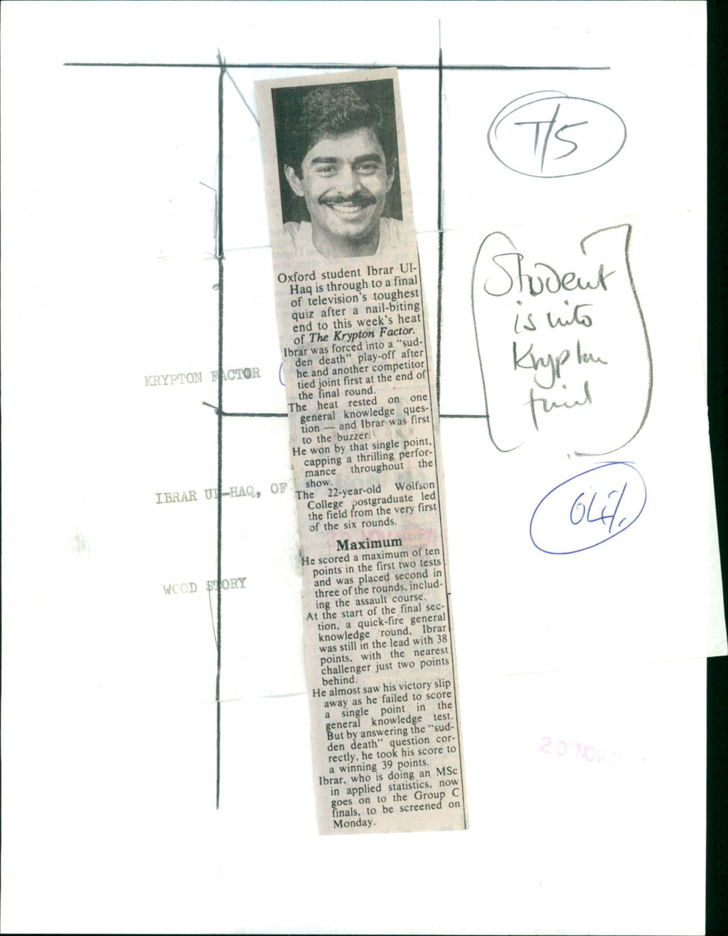 Oxford student Ibrar Ul-Haq is through to a final of television's toughest quiz after a nail-biting end of The Krypton Factor. Oxford student Ibrar Ul-Haq is through to a final of television's toughest quiz after a nail-biting end of The Krypton Factor.