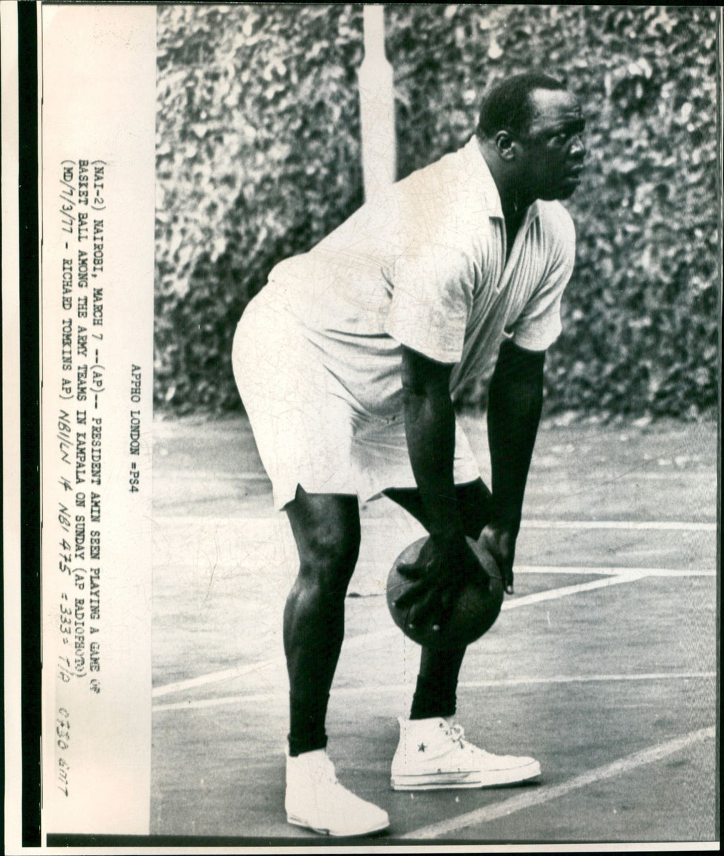 President Amin seen playing a game of basketball among the army teams in Kampala. President Amin seen playing a game of basketball among the army teams in Kampala.