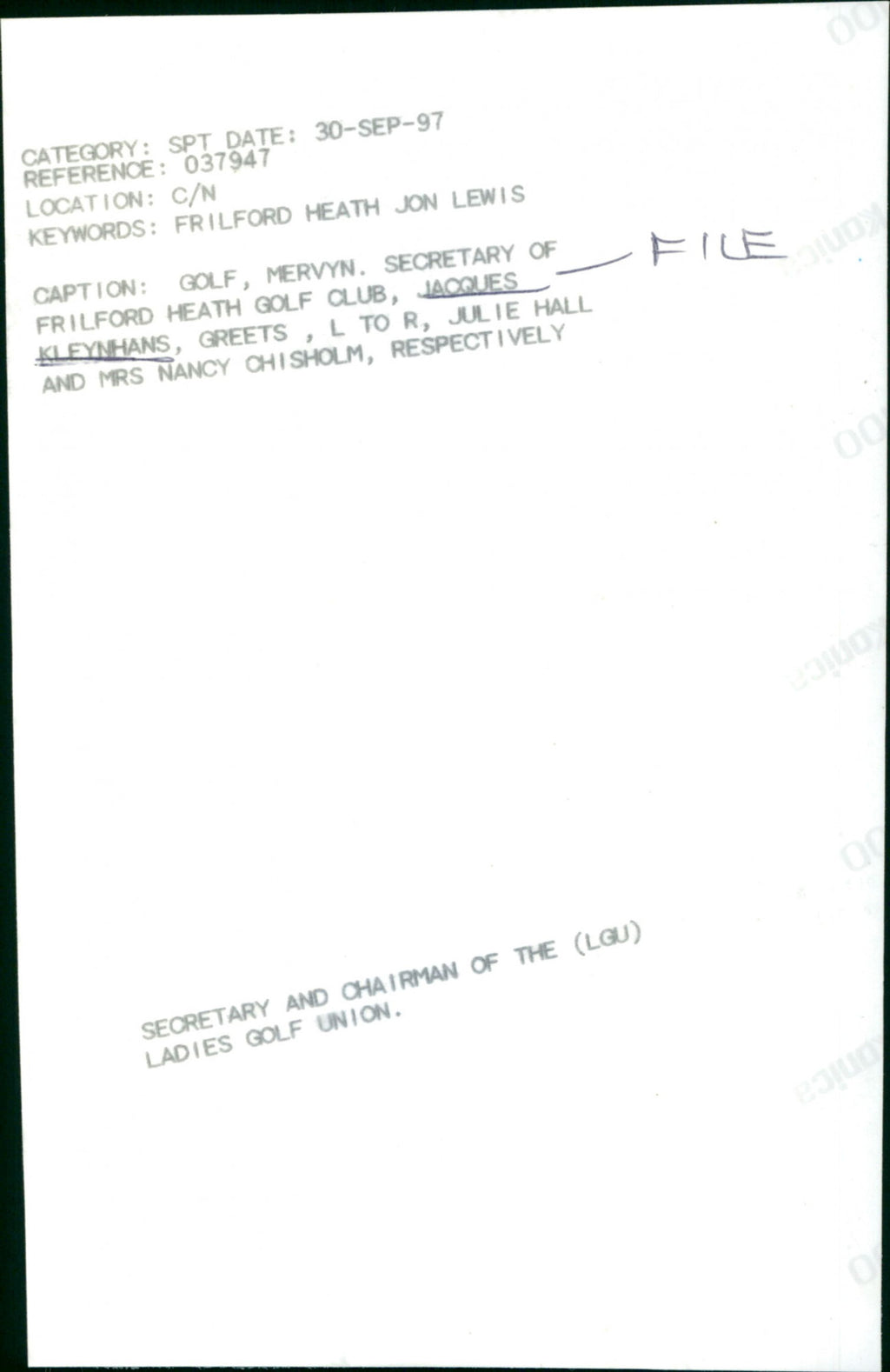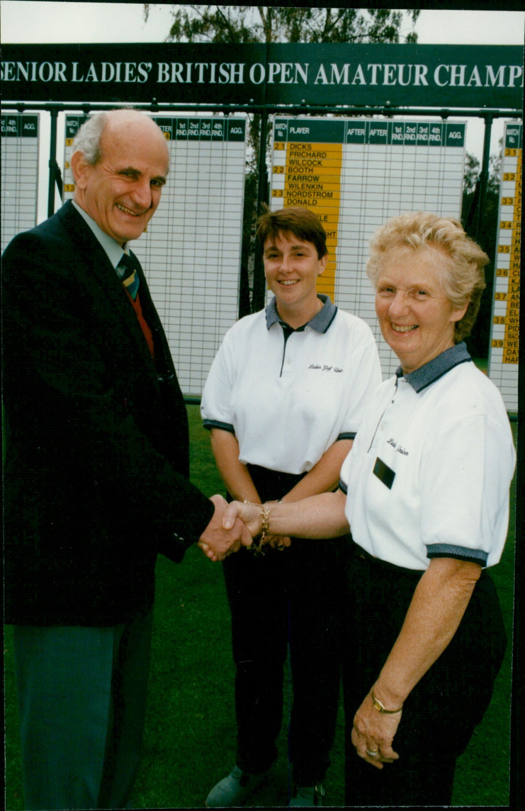 Golf, Mervyn, secretary of Frilford Heath Golf Club, Jacques Kleynhans, greets, (L-R) Julie Hall and Mrs. Nancy Chisholm, respectively. Golf, Mervyn, secretary of Frilford Heath Golf Club, Jacques Kleynhans, greets, (L-R) Julie Hall and Mrs. Nancy Chisholm, respectively.