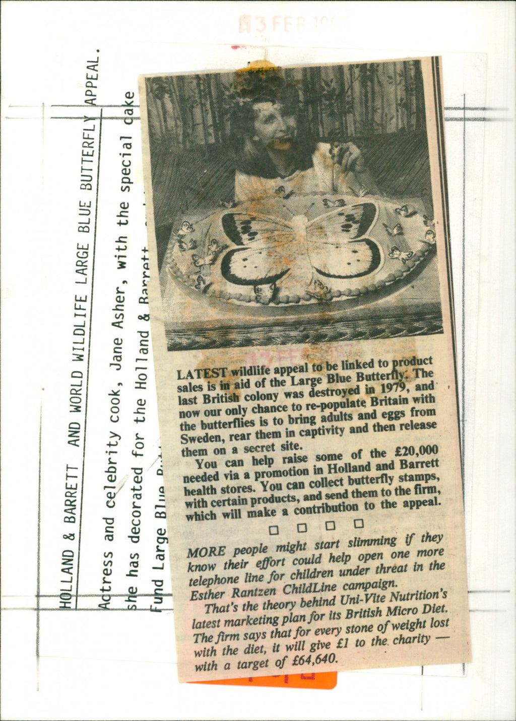 Jane Asher has wildlife appeal to be linked to product sales in aid of the Large Blue Butterfly. Jane Asher has wildlife appeal to be linked to product sales in aid of the Large Blue Butterfly.