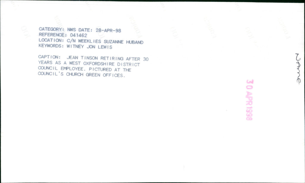 Jean Tinson retiring after 30 years as a West Oxfordshire District Council employee. Pictured at the Council's Church Green Offices. Jean Tinson retiring after 30 years as a West Oxfordshire District Council employee. Pictured at the Council's Church Green Offices.