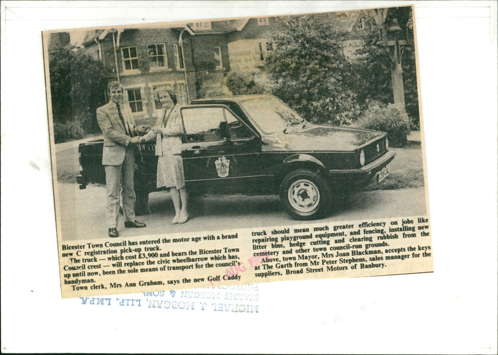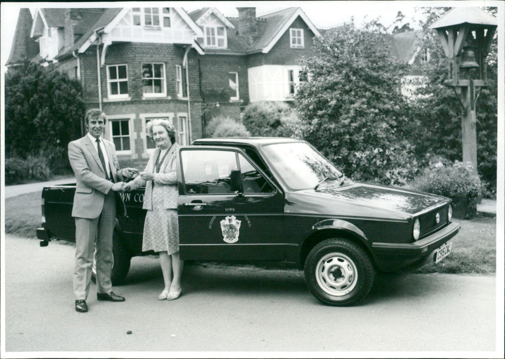 Town mayor, Mrs. Joan Blackman, accepts the keys at The Garth from Mr. Peter Stephens. Town mayor, Mrs. Joan Blackman, accepts the keys at The Garth from Mr. Peter Stephens.