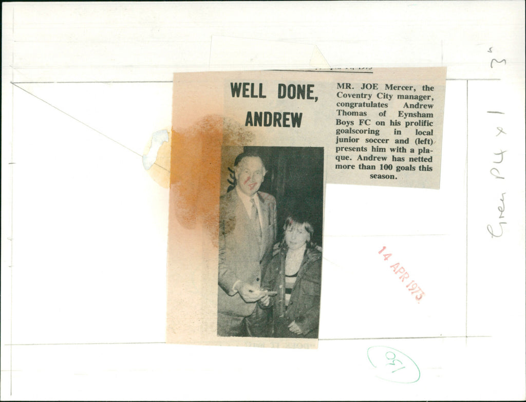 Joe Mercer, the Coventry City manager, congratulates Andrew Thomas on his prolific goalscoring in local junior soccer and presents him with a plaque. Joe Mercer, the Coventry City manager, congratulates Andrew Thomas on his prolific goalscoring in local junior soccer and presents him with a plaque.