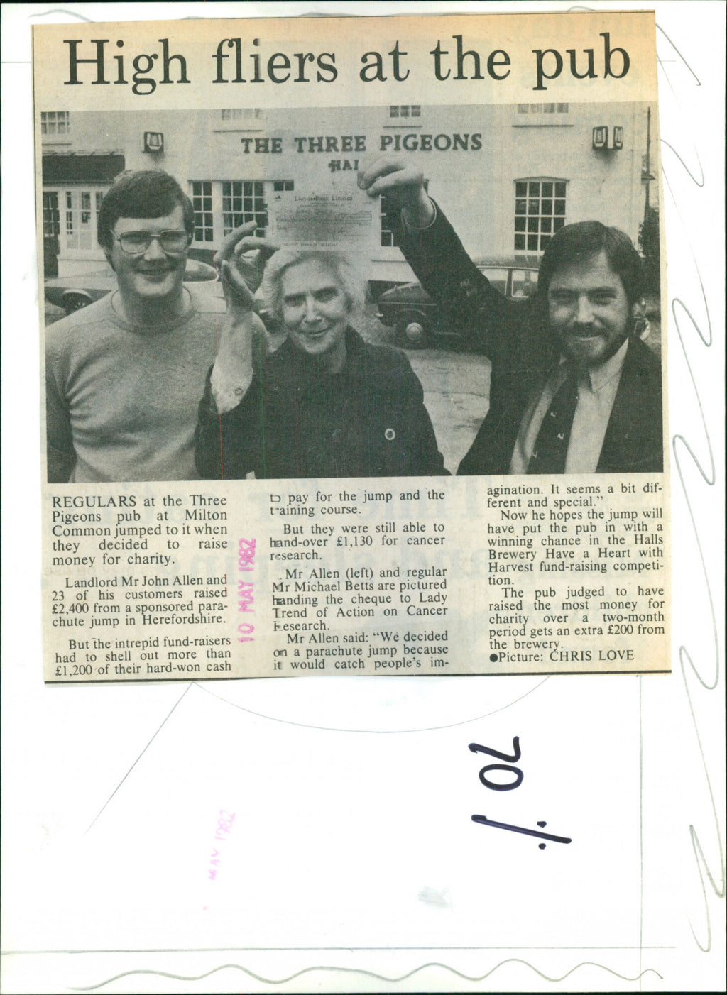 Landlord Mr. John Allen and 23 of his customers raised £2,400 form a sponsored parachute jump in Herefordshire. Landlord Mr. John Allen and 23 of his customers raised £2,400 form a sponsored parachute jump in Herefordshire.