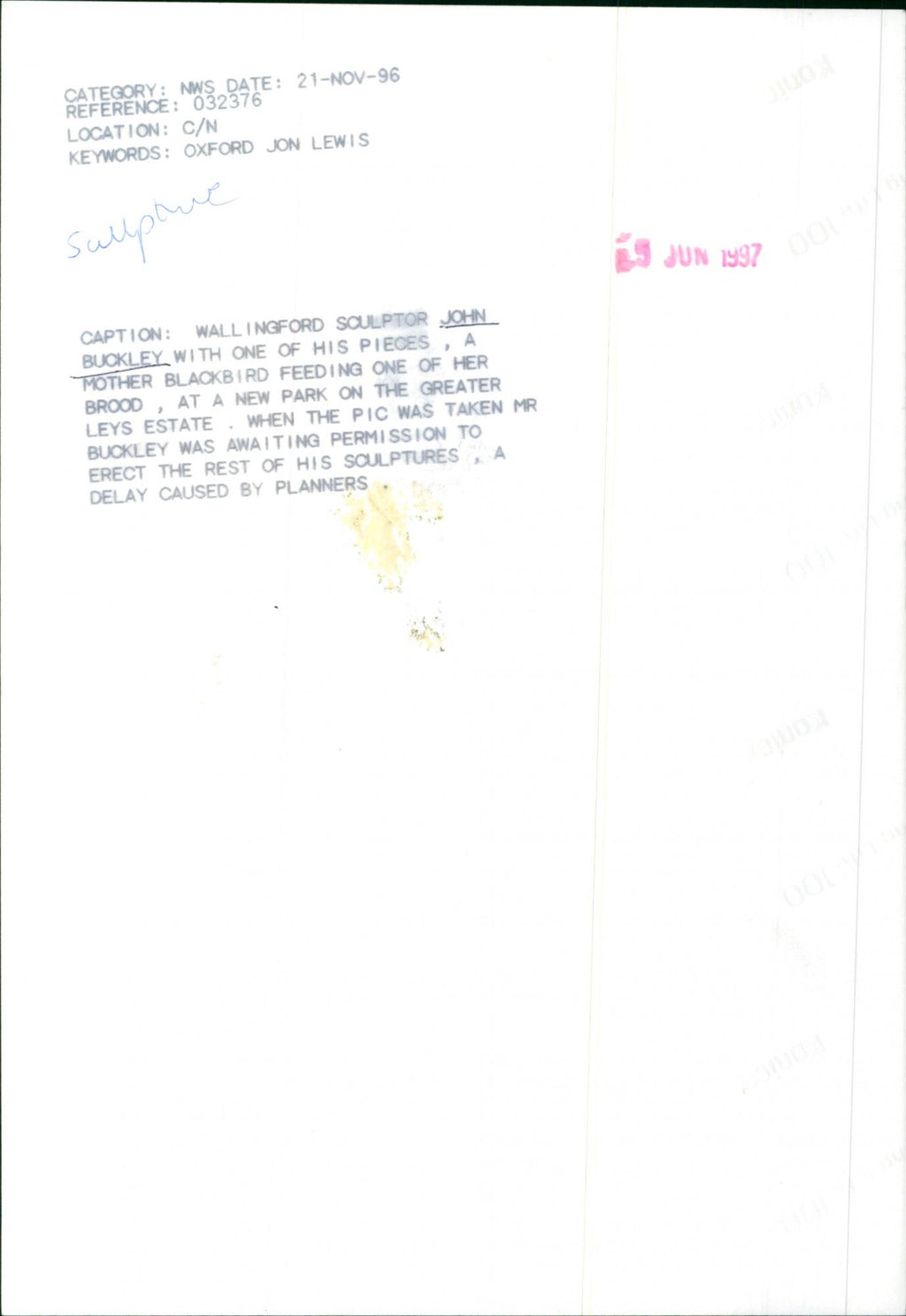 Wallingford Sculptor John Buckley with one of his pieces, a Mother Blackbird feeding one of her brood, at a new park on the Greater Leys Estate. Wallingford Sculptor John Buckley with one of his pieces, a Mother Blackbird feeding one of her brood, at a new park on the Greater Leys Estate.