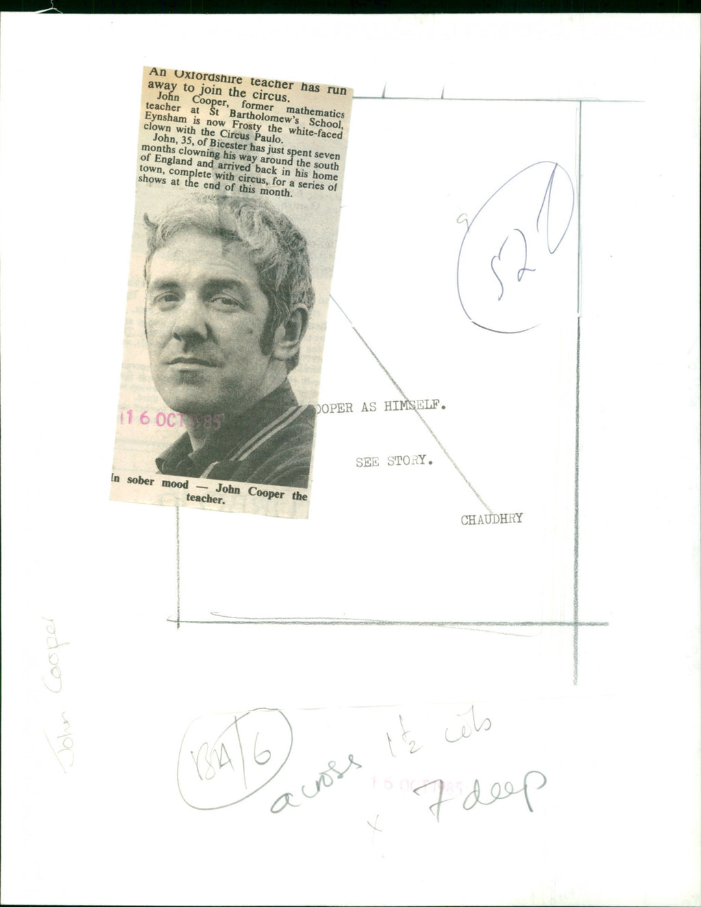 John Cooper, former math teacher at St. Bartholomew's School, Eynsham is now Frosty the white-faced clown with the Circus Paulo. John Cooper, former math teacher at St. Bartholomew's School, Eynsham is now Frosty the white-faced clown with the Circus Paulo.