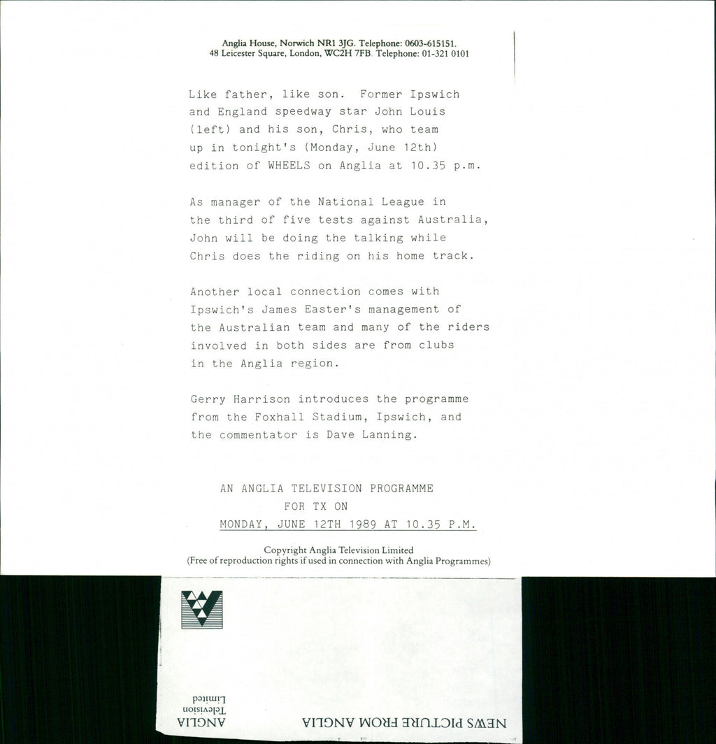 Former Ipswich and England speedway star John Louis (left) and his son, Chris, who team up in edition of WHEELS on Anglia. John will be doing the talking while Chris does the riding on his home track. Former Ipswich and England speedway star John Louis (left) and his son, Chris, who team up in edition of WHEELS on Anglia. John will be doing the talking while Chris does the riding on his home track.