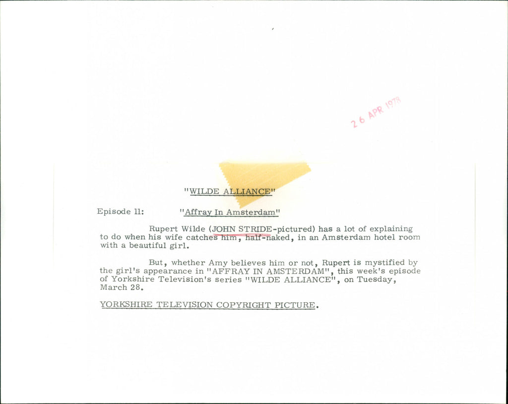 Rupert Wilde (John Stride) has a lot of explaining to do when his wife catches him, half-naked, in an Amsterdam hotel room with a beautiful girl. But whether Amy believes him or not Rupert is mystified by the girl's appearance in "Affray in Amsterdam", this episode of Yorkshire Television's series "Wilde Alliance". Rupert Wilde (John Stride) has a lot of explaining to do when his wife catches him, half-naked, in an Amsterdam hotel room with a beautiful girl. But whether Amy believes him or not Rupert is mystified by the girl's appearance in "Affray in Amsterdam", this episode of Yorkshire Television's series "Wilde Alliance".