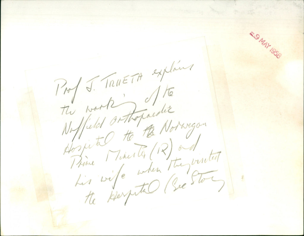 Prof. Josep Trueta explains the work of the Nuffield Orthopaedic Hospital to the Norwegian Prime Minister (r) and his wife when they visited the hospital. Prof. Josep Trueta explains the work of the Nuffield Orthopaedic Hospital to the Norwegian Prime Minister (r) and his wife when they visited the hospital.