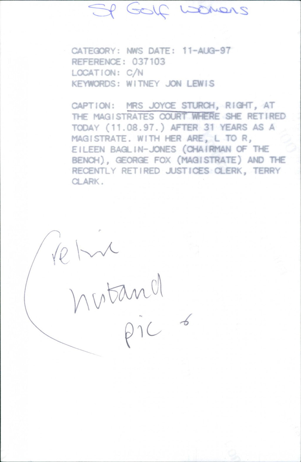 Mrs. Joyce Sturch, right, at the Magistrates Court where she retired 11.08.97 after 31 years as a Magistrate. With her are L-r, Eileen Baglin-Jones, George Fox and the recently retired Justices Clerk, Terry Clark Mrs. Joyce Sturch, right, at the Magistrates Court where she retired 11.08.97 after 31 years as a Magistrate. With her are L-r, Eileen Baglin-Jones, George Fox and the recently retired Justices Clerk, Terry Clark