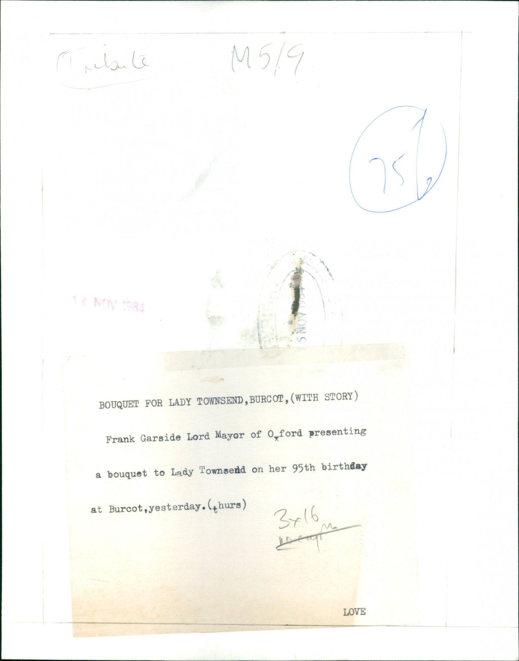 Frank Garside Lord Mayor of Oxford presenting a bouquet to Lady Townsend on her 95th birthday at Burcot. Frank Garside Lord Mayor of Oxford presenting a bouquet to Lady Townsend on her 95th birthday at Burcot.