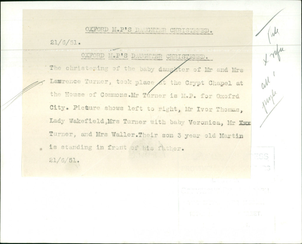 The christening of the daughter of Mr. and Mrs. Lawrence Turner, took place at the Crypt Chapel at the House of Commons. Mr. Turner is M. P. for Oxford City. Picture shows left to right: Ivor Thomas, Lady Wakefield, Mrs. Turner and daughter Veronica, Mr. Turner, and Mrs. Waller. Their son Martin is standing in front of his father. The christening of the daughter of Mr. and Mrs. Lawrence Turner, took place at the Crypt Chapel at the House of Commons. Mr. Turner is M. P. for Oxford City. Picture shows left to right: Ivor Thomas, Lady Wakefield, Mrs. Turner and daughter Veronica, Mr. Turner, and Mrs. Waller. Their son Martin is standing in front of his father.