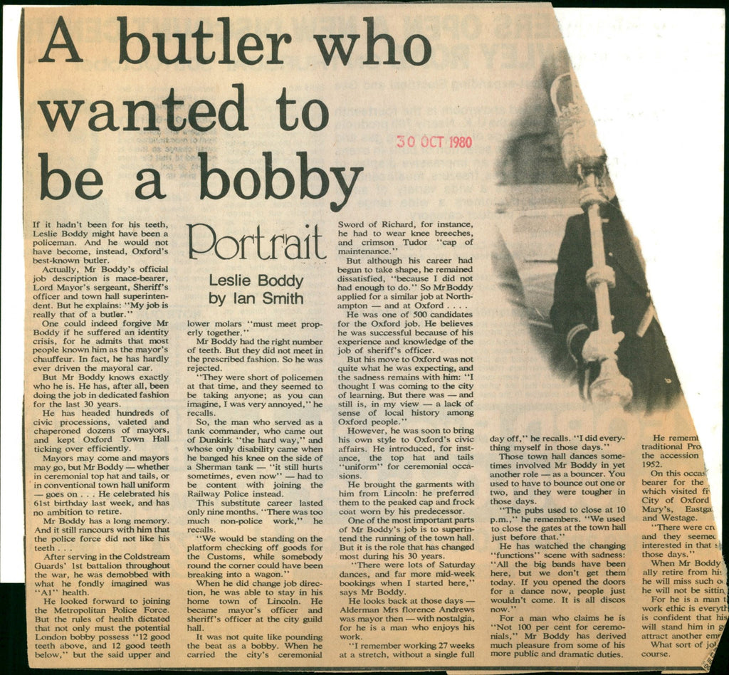 Leslie Boddy Oxford's well-known butler. Leslie Boddy Oxford's well-known butler.
