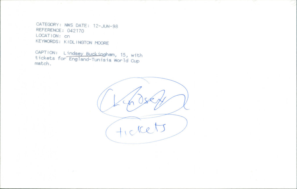 Lindsey Buckingham with tickets for England-Tunisia World Cup match. Lindsey Buckingham with tickets for England-Tunisia World Cup match.