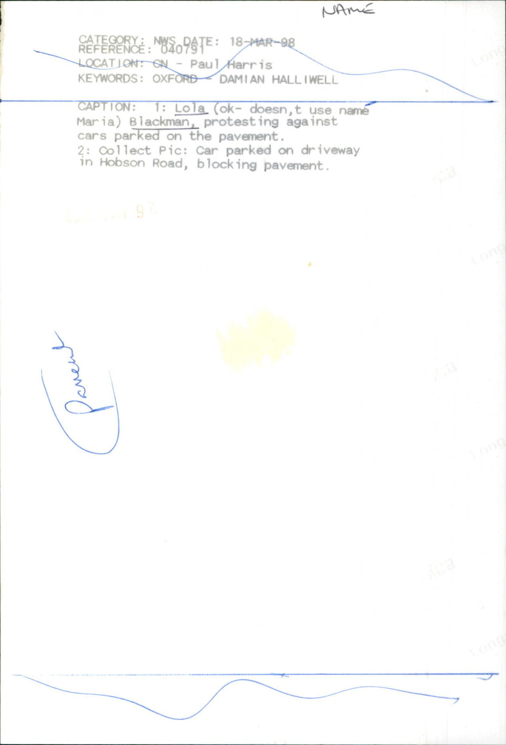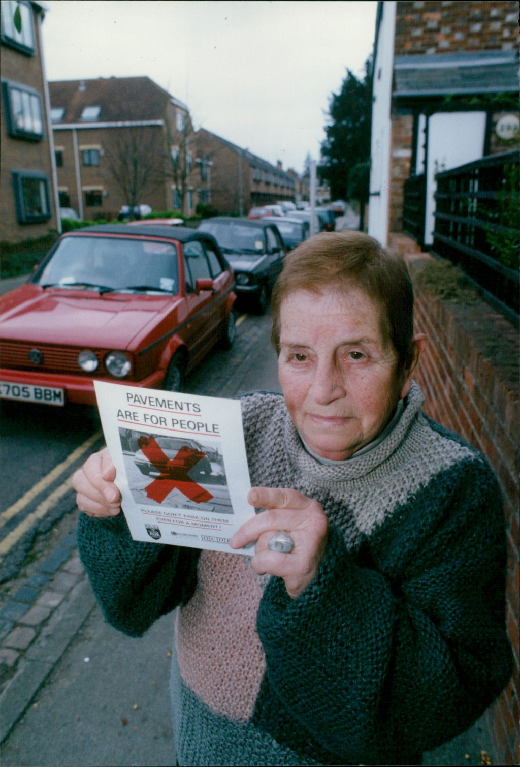 Lola Blackman, protesting against cars parked on the pavement. Lola Blackman, protesting against cars parked on the pavement.