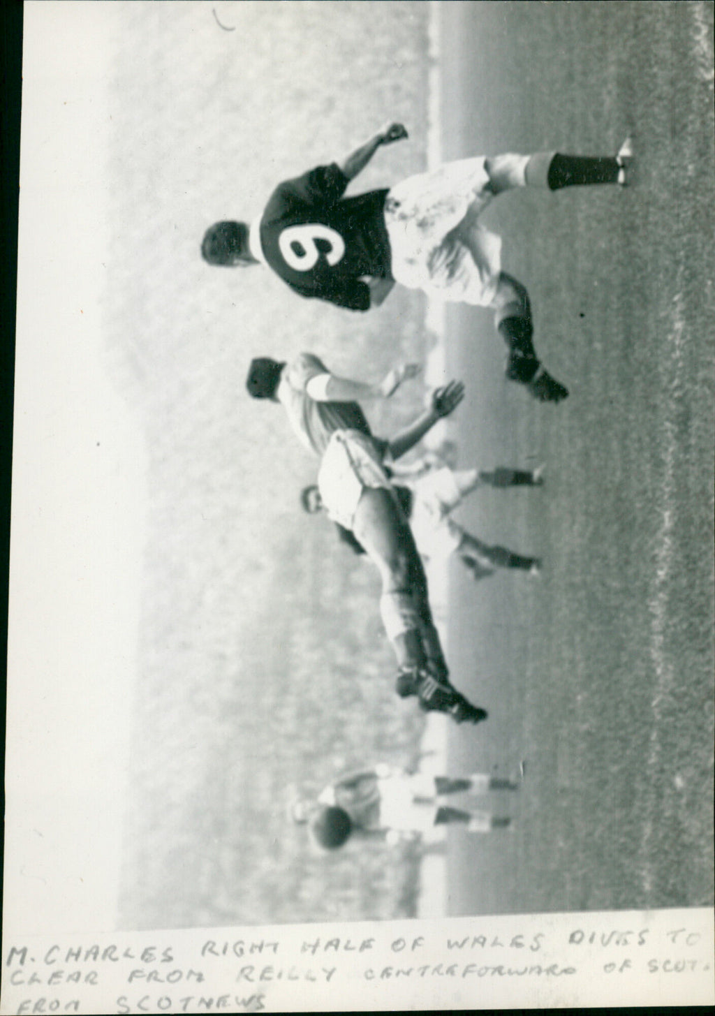 M Charles half of wales dives to clear from Reilly of scot - Vintage Photograph